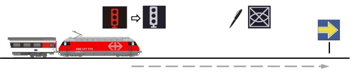 | ⇒ | «TAF» peut aussi déjà être proposé à hauteur d’un signal de position ETCS précédant le signal d’arrêt ETCS. (Après confirmation de «TAF», il est alors pos- sible de poursuivre la marche dès réception de l’«autorisation de circuler CAB»). |