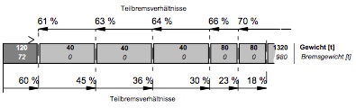 | Quant au rapport de freinage est calculé depuis la tête du train : comme la valeur la plus basse est de 18% (après le 5e wagon) seul une déclivité maximale de 7‰ peut être parcouru avec cette composition. |